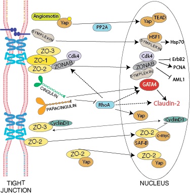 Figure 3 (modified from Spadaro et al, Essays Biochem. 2012). Scheme of tight junction proteins implicated in signaling to the nucleus through different transcription factors. CGN and CGNL1 regulate claudin-2 expression throuh both Rho-dependent and Rho-independent pathways, and through GATA-4 (Guillemot et al, 2013). ZO proteins (ZO-1, ZO-2, ZO-3) redundantly regulate the transcription factor DbpA/ZONAB (Spadaro et al., 2014).