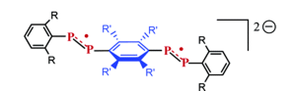 EPR spectra show that one-electron reduction of bis(3-phenyl-6,6-(trimethylsilyl)phosphinine-2-yl)dimethylsilane (1) on an alkali mirror leads to a radical anion that is localized on a single phosphinine ring, whereas the radical anion formed from the same reaction in the presence of cryptand or from an electron transfer with sodium naphthalenide is delocalized on the two phosphinine rings. Density functional theory (DFT) calculations show that in the last species the unpaired electron is mainly confined in a loose P — P bond (3.479 Å), which results from the overlap of two phosphorus p orbitals. In contrast, as attested by X-ray spectroscopy, the P — P distance in neutral 1 is large (5.8 Å). As shown by crystal structure analysis, addition of a second electron leads to the formation of a classical P — P single bond (P — P 2.389 Å). Spectral modifications induced by the presence of cryptand or by a change in the reaction temperature are consistent with the formation of a tight ion pair that stabilizes the radical structure localized on a single phosphinine ring. It is suggested that the structure of this pair hinders internal rotation around the C — Si bonds and prevents 1 from adopting a conformation that shortens the intramolecular P — P distance. The ability of the phosphinine radical anion to reversibly form weak P — P bonds with neutral phosphinines in the absence of steric hindrance is confirmed by EPR spectra obtained for 2,6-bis(trimethylsilyl)-3-phenylphosphinine (2). Moreover, as shown by NMR spectroscopy, in this system, which contains only one phosphinine ring, further reduction leads to an intermolecular reaction with the formation of a classical P — P bond. | ||||||||