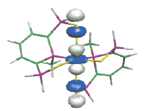 Electrochemical and chemical reductions of Rh(I) complexes of LP4 (a macrocycle containing four phosphinine rings) and of LP2S2 (a macrocycle containing two phosphinine rings and two thiophene rings) lead, in liquid solution, to EPR spectra exhibiting large hyperfine couplings with 31P nuclei. An additional coupling (27 MHz) with 103Rh is detected, in the liquid state, for the spectrum obtained with [LP2S2Rh(0)]; moreover, resolved 31P hyperfine structure is observed in the frozen solution spectrum of this latter complex. DFT calculations performed on Rh(I) complexes of model macrocycles L‘P4 and L‘P2S2 indicate that, in these systems, the metal coordination is planar and that one-electron reduction induces a small tetrahedral distortion. The calculated couplings, especially the dipolar tensors predicted for [L‘P2S2Rh(0)], are consistent with the experimental results. Although the unpaired electron is mostly delocalized on the ligands, the replacement of two phosphinines by two thiophenes tends to increase the rhodium spin density (ρRh =0.35 for [L‘P2S2Rh(0)]). It is shown that coordination to Rh as well as one-electron reduction of the resulting complex provoke appreciable changes in the geometry of the macrocycle. | ||||||||