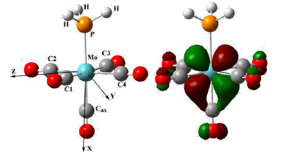A radical species characterized by a large g-anisotropy and a clearly resolved hyperfine structure with 95/97Mo and 31P nuclei is formed, at 77 K, by radiolysis of a single crystal of Mo(CO)5PPh3. The corresponding EPR signals disappear irreversibly with increasing temperature and the angular dependence of the various coupling constants imply a spin delocalization of not, vert, ∼60% and not, vert, ∼4% on the molybdenum and the phosphorus atoms, respectively and are, a priori, consistent with the trapping of a one-electron deficient centre. The ability of DFT to predict the EPR tensors for a 17-electron Mo(I) species is verified by calculating the g-tensor and the various 14N and 13C coupling tensors previously reported by Hayes for [Mo(CN)5NO]3-. Calculations at the B3LYP/ZORA/SOMF level of theory show that, in contrast to Mo(CO)5PH3, one-electron oxidation of Mo(CO)5PPh3 causes an appreciable change in the geometry of the complex. The g-tensor and the 95/97Mo and 31P isotropic and anisotropic coupling constants calculated for [Mo(CO)5PPh3]+· confirm the trapping of this species in the irradiated crystal of Mo(CO)5PPh3; they also show that the conformational modifications induced by the electron release are probably hindered by the nearby complexes. | ||||||||