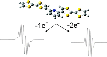 A series of bis(TTF) donors containing aromatic linkers between the two TTF units has been synthesized in order to investigate on the electronic structure of the oxidized species from an experimental and theoretical point of view. A mono(TTF)-pyridine compound has been also prepared and characterized by single-crystal X-ray diffraction analysis. Oxidation of a solution of 2,6-bis(TTF)-pyridine (TTF-Pyr-TTF) or of 1,3-bis(TTF)-benzene (TTF-Bz-TTF) in CH2Cl2 with less than 0.1 equivalent of [Cp2Fe][PF6] gives rise to a seven-line EPR spectrum consistent with the hyperfine structure calculated by DFT for the corresponding radical monocation. Increasing the proportion of oxidant leads to a four-line hyperfine structure, similar to the quartet pattern observed after oxidation of mono(TTF)-pyridine (Pyr-TTF) or mono(TTF)-benzene (Bz-TTF). In good accordance with the very weak value of J calculated by DFT for the dicationic biradicals these four-line spectra are attributed to [2,6-bis(TTF)-pyridine]2+ and [1,3-bis(TTF)-benzene]2+. Similar experimental results are obtained for 1,4-bis(TTF)-benzene. In this case, however, electrochemical oxidation leads to the monoradical at low potential and to the diradical at higher potential, while only the diradical could be observed by electrochemical oxidation of 2,6-bis(TTF)-pyridine or of 1,3-bis(TTF)-benzene. | ||||||||