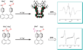 Two molecules containing two phenylphosphaalkene moieties linked by an anthracene (1) or by a naphthalene (2) ring have been synthesized and their crystal structures have been determined. While electrochemical measurements show that these two systems are easily reduced, EPR spectra indicate that, at room temperature, the electronic structures of the two reduction compounds 1˙− and 2˙− are quite different. In 1˙−, in good accordance with DFT predictions, the unpaired electron is delocalized on the full molecule while in 2˙− it is confined on a single phosphaalkene moiety. This difference is attributed to the short distance between the two phenylphosphaalkene groups in 2˙− which hinders their reorientation after addition of an electron. The role of this motion is consistent with the fact that two additional paramagnetic species are detected at 145 K: the dianion 22− characterized by a rather small exchange coupling constant and the radical monoanion 2*˙− resulting from the formation of a one electron P–P bond. These two species are probably reaction intermediates which can lead to the formation of biphosphane. | ||||||||