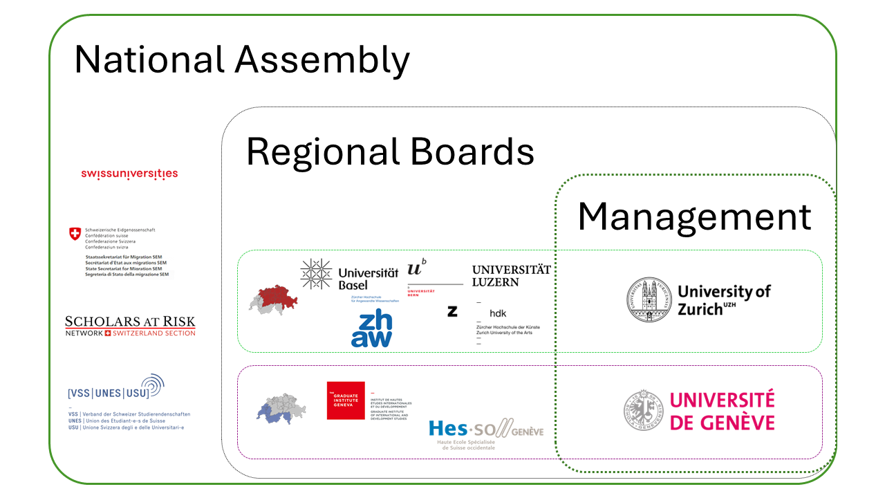 All partners are represented in the national assembly. The national assembly serves as the sounding board of the project and ensures the national coordination of Uni4Refugees. Additionally, two regional boards coordinate the regional activities of the two hubs in Eastern and Western Switzerland.