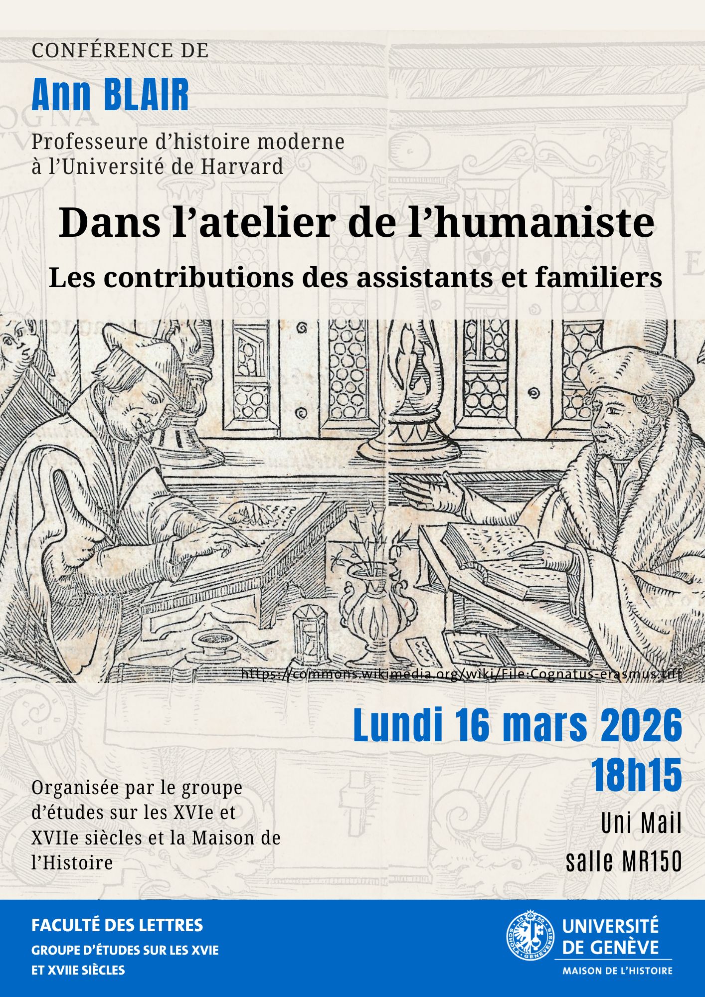 Le travail d’érudition humaniste est généralement représenté comme solitaire dans les sources iconographiques et bibliographiques, de la Renaissance à nos jours. Or, ces représentations occultent la contribution de différents collaborateurs – membres de la famille, étudiants ou assistants embauchés. Le recours à ces aides (qu’Ann Blair appelle amanuenses) était très répandu, mais reste peu visible. La conférence présentera quelques exemples tirés de contextes différents – notamment autour d’Érasme, de Bullinger et de Petrus Ramus (Pierre de La Ramée) – pour identifier ces amanuenses, le travail qu’ils ont accompli et les types de sources grâce auxquelles on peut le documenter. Le matériau présenté sera tiré d’un livre à paraître en juillet 2026 : In the Scholar’s Workshop: Hidden Histories of Collaboration and Authorship (Princeton).