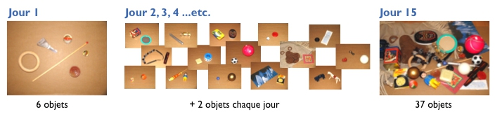 Dans cette première phase collective, il s’agit de constituer le « trésor » de la classe. Le coffre aux trésors va s’enrichir chaque jour de nouveaux objets et donner l’occasion d’un jeu collectif quotidien de désignation orale et de mémoire collective.
