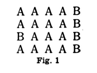 1â« extension », câest-Ă -dire la rĂ©union : mais on ne perçoit prĂ©cisĂ©ment pas cette rĂ©union comme telle, donc lâextension Ă laquelle se rĂ©duit la classe en tant que classe (par opposition Ă sa « comprĂ©hension » qui nâest plus la classe, mais un systĂšme de prĂ©dicats qui sont psychologiquement des relations de ressemblances et de diffĂ©rences). Ou, si lâon perçoit cette rĂ©union, câest en tant quâagrĂ©gat spatial, et nous sortons des caractĂšres de la classe. Par exemple, dans la figure 1 ci-contre,1 on perçoit bien deux sortes d Ă©lĂ©ments : les uns correspondant a A (si nous les appelons des « A » nous les conceptualisons et sortons alors des limites de la perception), les autres Ă B et nous « voyons » bien deux ensembles distincts, lâun formĂ© de la colonne de droite plus la troisiĂšme figure de la colonne de gauche, lâautre formĂ© du reste des Ă©lĂ©ments. Mais ces ensembles que nous percevons ainsi ne sont prĂ©cisĂ©ment plus des classes, puisque ce sont des agrĂ©gats spatiaux et que ces agrĂ©gats ne contiennent pas tous les « A » ni tous les « B » situĂ©s en dehors du champ perceptif. Dire que ce sont des Ă©lĂ©ments de forme A et des Ă©lĂ©ments de forme B que je perçois sur cette figure nâavancerait pas les choses, puisque ce serait justement reconnaĂźtre quâils sont groupĂ©s spatialement.
