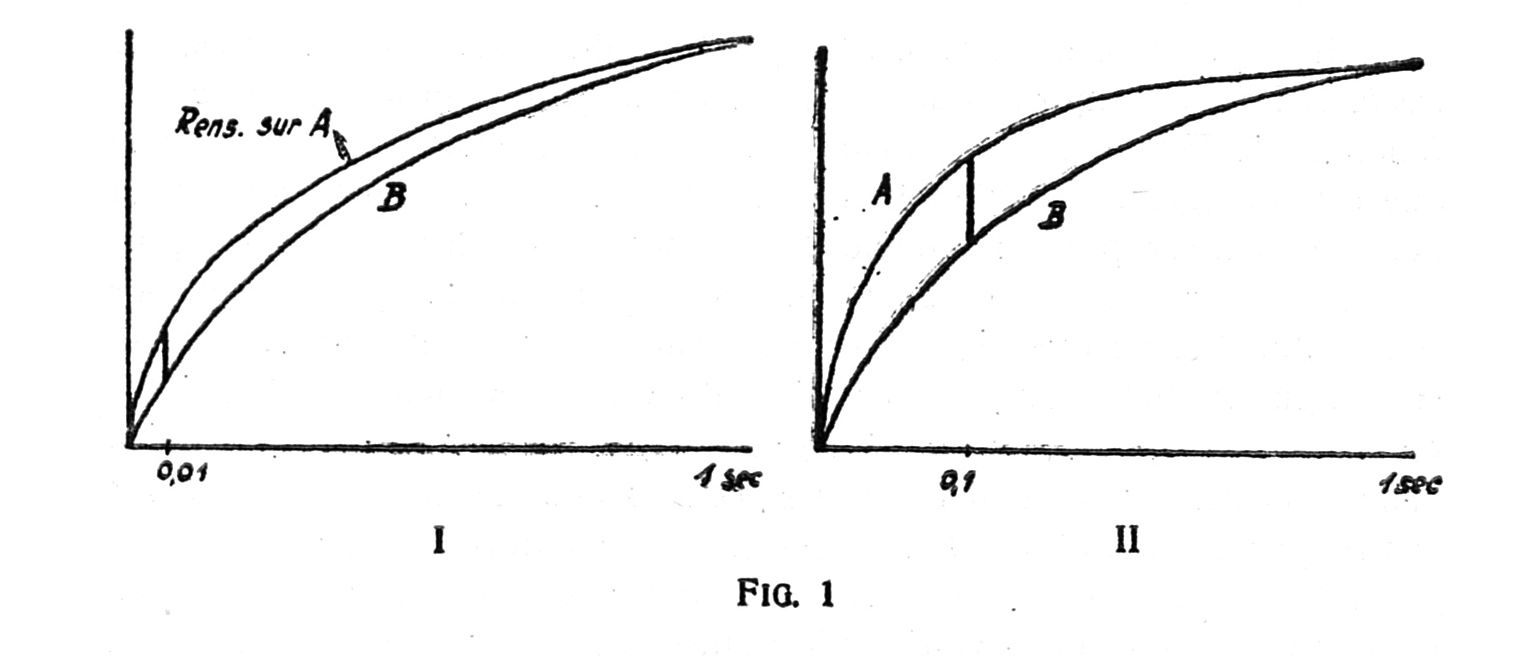 I. L’affaiblissement de l’erreur avec la durée est due simplement au fait qu’il s’agit d’une erreur élémentaire II ou surestimation relative. Chaque élément A ou B s’allonge subjectivement avec la durée, c’est- à -dire que chaque erreur élémentaire 1 augmente avec la durée, sur B comme sur A (selon les exponentielles indiquées). Mais l’erreur élémentaire II constituant la différence entre ces deux erreurs élémentaires I, cette diminution de l’erreur II signifie alors que la différence entre les deux erreurs I s’atténue avec l’augmentation des rencontres, du fait