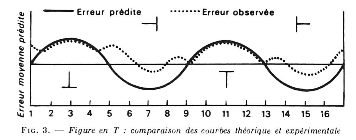 Le maximum thĂ©orique est situĂ© ainsi Ă A1 - A,2 - A/2 (donc Ă 25) et la courbe dĂ©croĂźt systĂ©matiquement des deux cĂŽtĂ©s. Ces onze valeurs correspondant aux positions 1 Ă 5 de la fig. 2, on retrouvera ensuite la mĂȘme courbe pour les positions 5 Ă 9, puis 9 Ă 13 et enfin 13 Ă 16 et Ă 1. Par contre, si lâon exprime les erreurs sur la seule verticale (jouant donc tantĂŽt le rĂŽle de A tantĂŽt celui de B) on trouvera thĂ©oriquement une erreur alternativement positive (1-5 et 9-13) et nĂ©gative (6-8 et 14-16), correspondant au trait plein de la figure 3.
