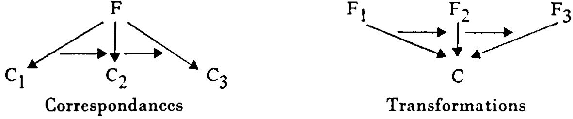 4 / On trouve ainsi à tous les niveaux des correspondances et des transformations, mais, avant d’exposer l’hypothèse générale qui inspirera cet ouvrage quant à leurs relations, encore faut-il compléter notre terminologie par l’indication dcs critères servant à leur distinction. Nous en voyons sept. En premier lieu, les transformations engendrent les états, puisque constituant des changements d’états, tandis que les correspondances se bornent à les relier statiquement, pour les comparer sans les modifier ; et, lorsqu’elles les mettent en relation avec des transformations, c’est sans engendrer ni altérer celles-ci, qui sont alors considérées comme des objets ou contenus de pensées, donc comme des termes à relier en analogie avec les états. On dira peut-être qu’en ajoutant une nouvelle forme aux états les correspondances les modifient par cela même, mais il faut distinguer les formes qui se bornent à enrichir d’un nouveau cadre un contenu préexistant et celles qui le structurent jusqu’à le construire (cf. la suite des nombres naturels) ou le reconstruire. D’où la seconde différence : les transformations modifient matériellement les objets ou logiquement les contenus sur lesquels elles portent, tandis que les correspondances s’y soumettent et consistent à appliquer les mêmes formes à de nouveaux contenus eux aussi contraignants (voir la figure ci-dessus, suggérée par G. Henriques).