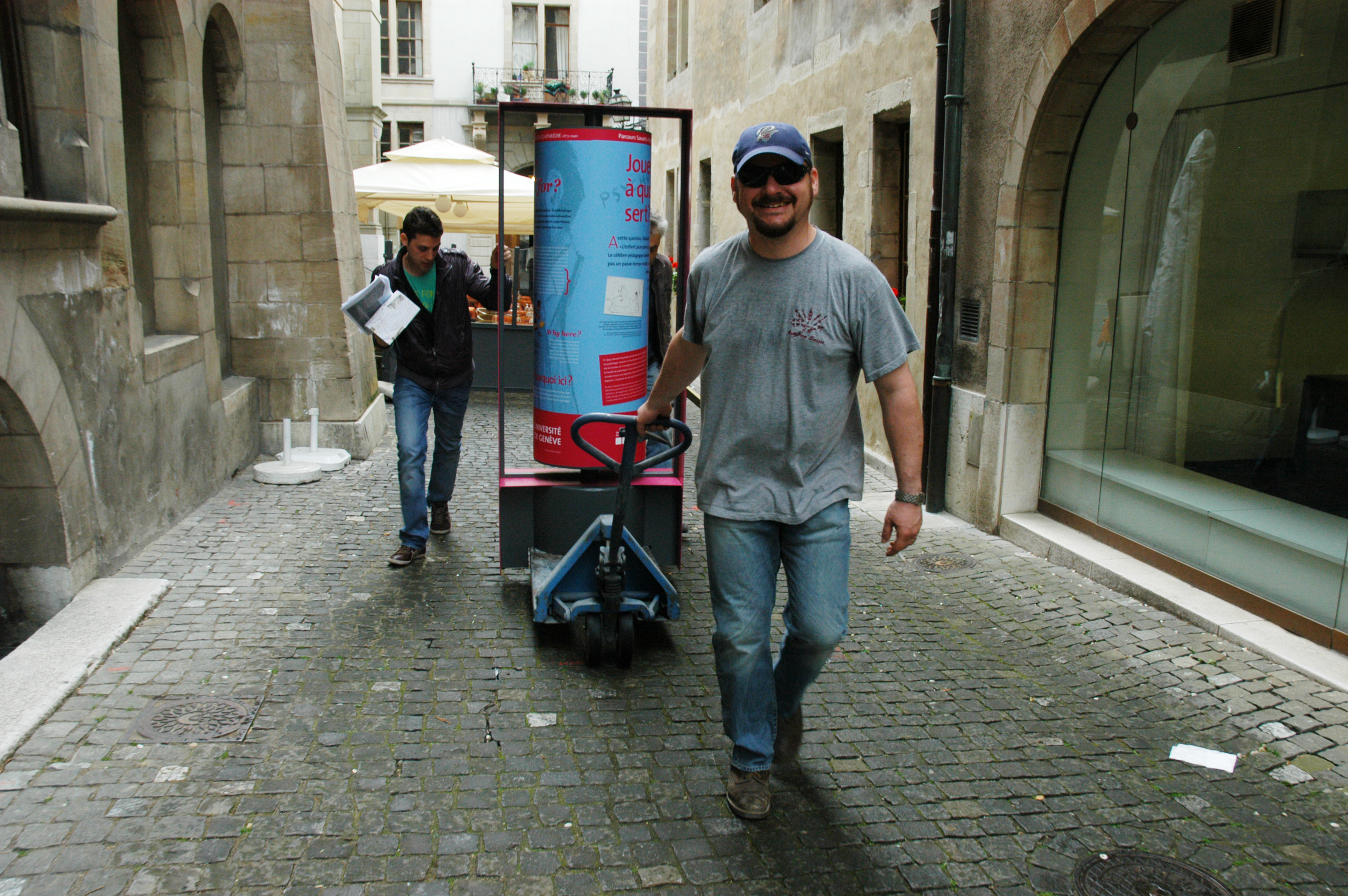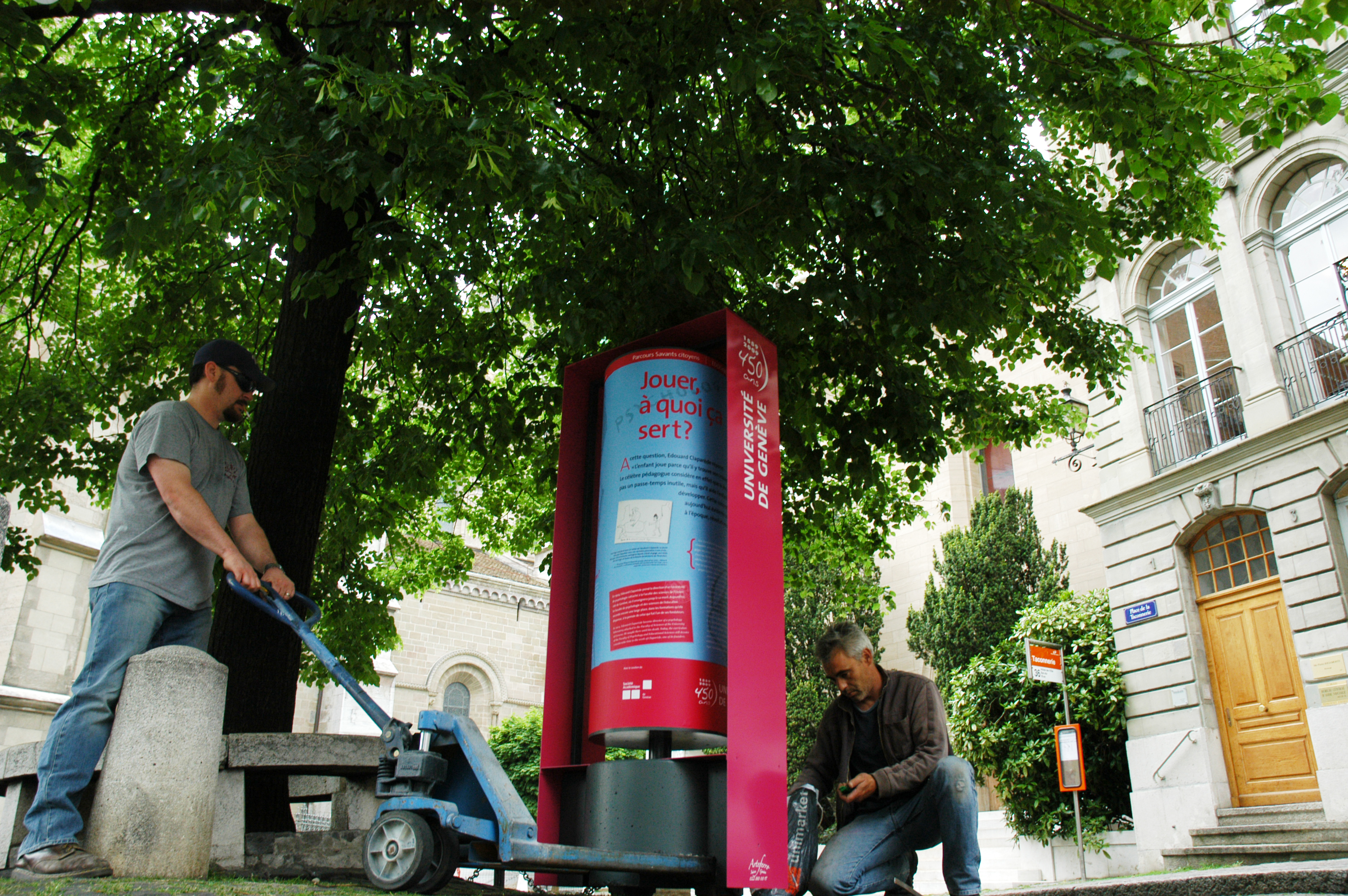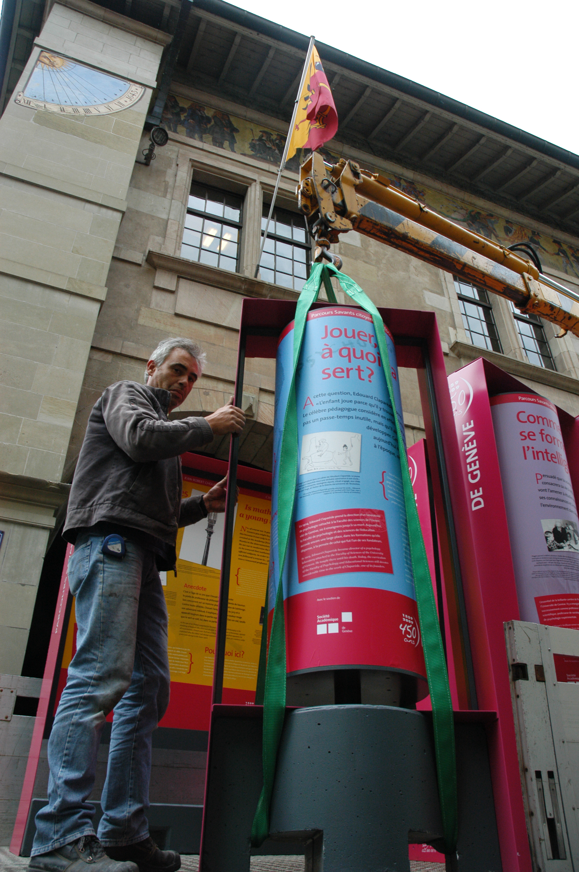 ![]() | Légende: Installation des postes de l'exposition dans la Vieille-Ville. Mai 2009. Crédit: Jacques Erard/UNIGE Télécharger en haute résolution top |