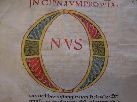 ms.Genève, BGE, lat. 1 f. 279v A. Onus (Naum) dimensions du feuillet : 608x394 mm dimensions de l'initiale : 112x110 mm (hauteur = 14 lignes d'écriture)