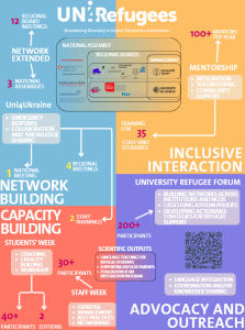 In the poster, we highlight how Uni4Ukraine exemplifies the resilience of the Uni4Refugees framework, especially in a time of crisis. The initiative was able to build on the solid foundation of existing partnerships and swiftly expand its reach to address the emergency needs of displaced Ukrainians. It also illustrates the flexibility and adaptability of the U4R program in the face of unexpected global challenges. In particular, it shows how the program was able to extend its resources to address urgent needs, making a real difference in the lives of those affected by conflict.