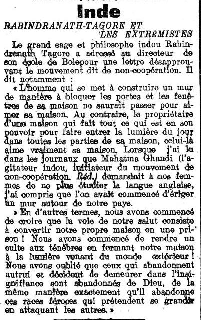 Journal de Genève, 03 mai 1921Né en 1861 dans une famille très riche et éduquée de la caste des brahmanes, le poète grandit dans le Bengale cosmopolite et pénétré par la culture anglaise, ce qui préfigure le syncrétisme résumant « l’œuvre-vie » de ce libre-penseur engagé (Hanna-El-Daher, 2014, p. 76). S’il est à l’origine des hymnes actuels de l’Inde et du Bangladesh, il est un artiste avant d’être un politique. En effet, même si les deux hommes s’admirent, Tagore se méfie du nationalisme de Gandhi et de la tyrannie des foules qui sied mal à la subtilité de son positionnement, le joug du Raj britannique n’empêchant pas le poète d’apprécier Shakespeare :