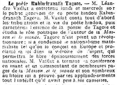 Entrefilet concernant une conférence sur Tagore à Genève, Journal de Genève, 25 février 1921.