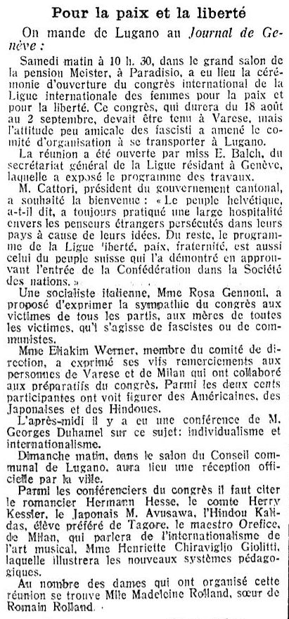 Article relatant la présence de Kalidas Nag à la cérémonie d’ouverture du Congrès international de la Ligue internationale des femmes pour la paix et la liberté, Journal de Genève, 20 août 1922.