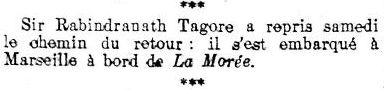 Article de Paul Seippel, Journal de Genève, 06 mars 1922Après un passage à Zurich, où il produit une aussi grande impression qu’à Genève et chante son hymne national en langue bengali (Journal de Genève, 20 mai 1921), ainsi qu’une halte à l’Université de Munich, où il prêche la non-violence devant une foule nombreuse et conquise, Tagore se rend en Suède, où une certaine propagande se déploie autour de lui, dans le cadre de la rivalité entre la France et l’Allemagne qui cherchent à monopoliser le dialogue avec l’Inde via son « représentant le plus moderne » (Berthet, 2019).