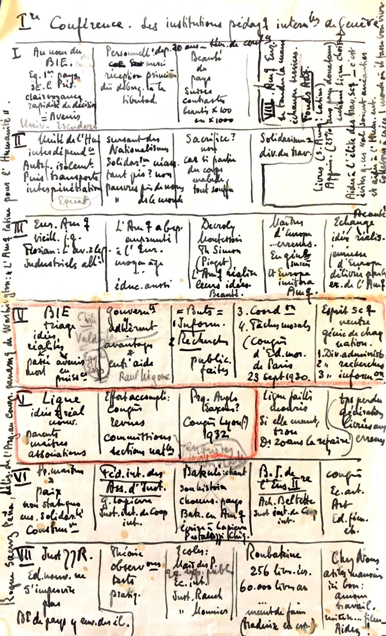Plan de la première conférence prononcée en Uruguay en août 1930 Le voyage du couple Ferrière est aussi parsemé de surprises. En effet, le cycle de conférences prévu au Brésil n’a finalement pas lieu en raison de la « Révolution d’octobre » qui éclate alors que leur bateau approche des côtes brésiliennes.