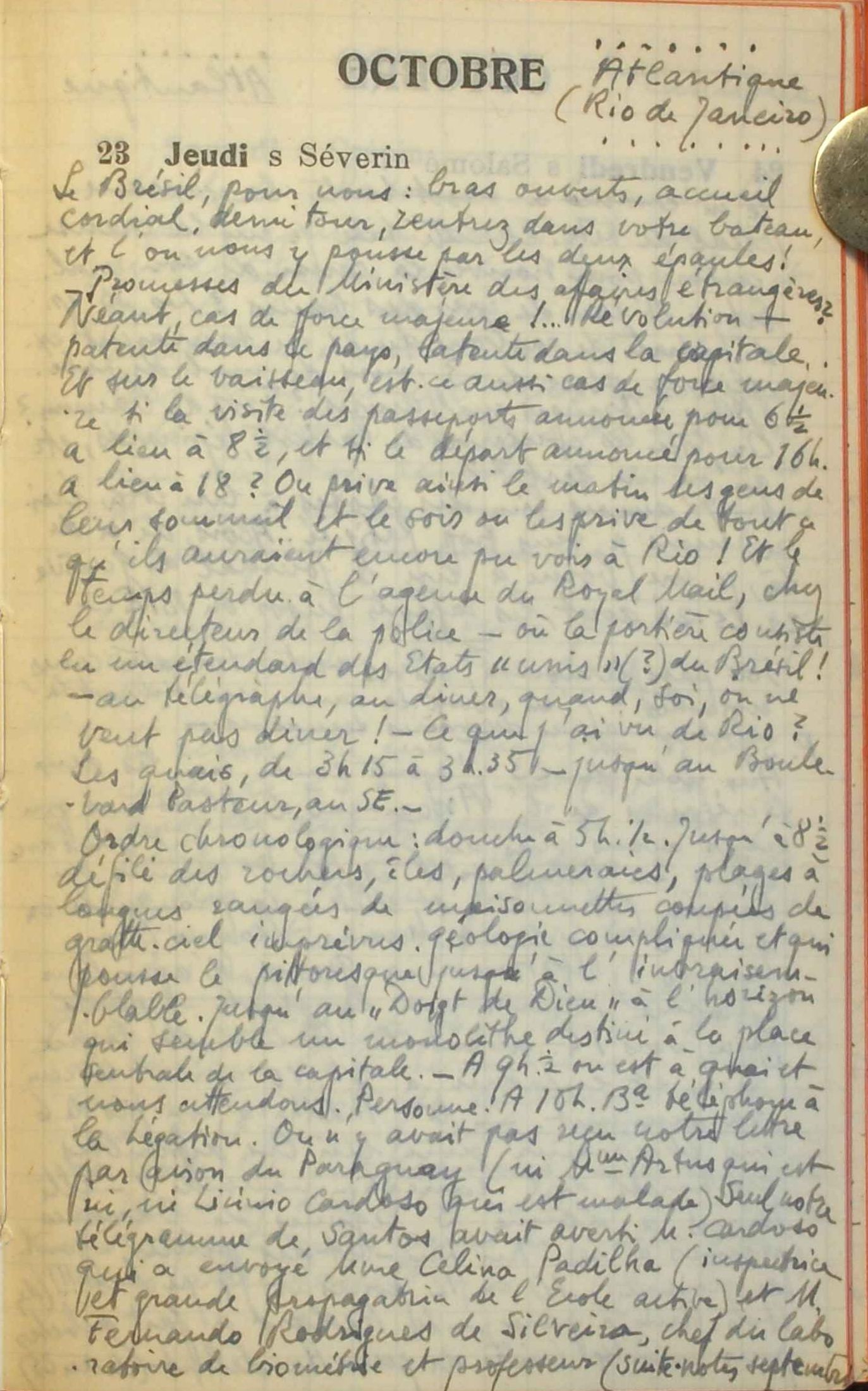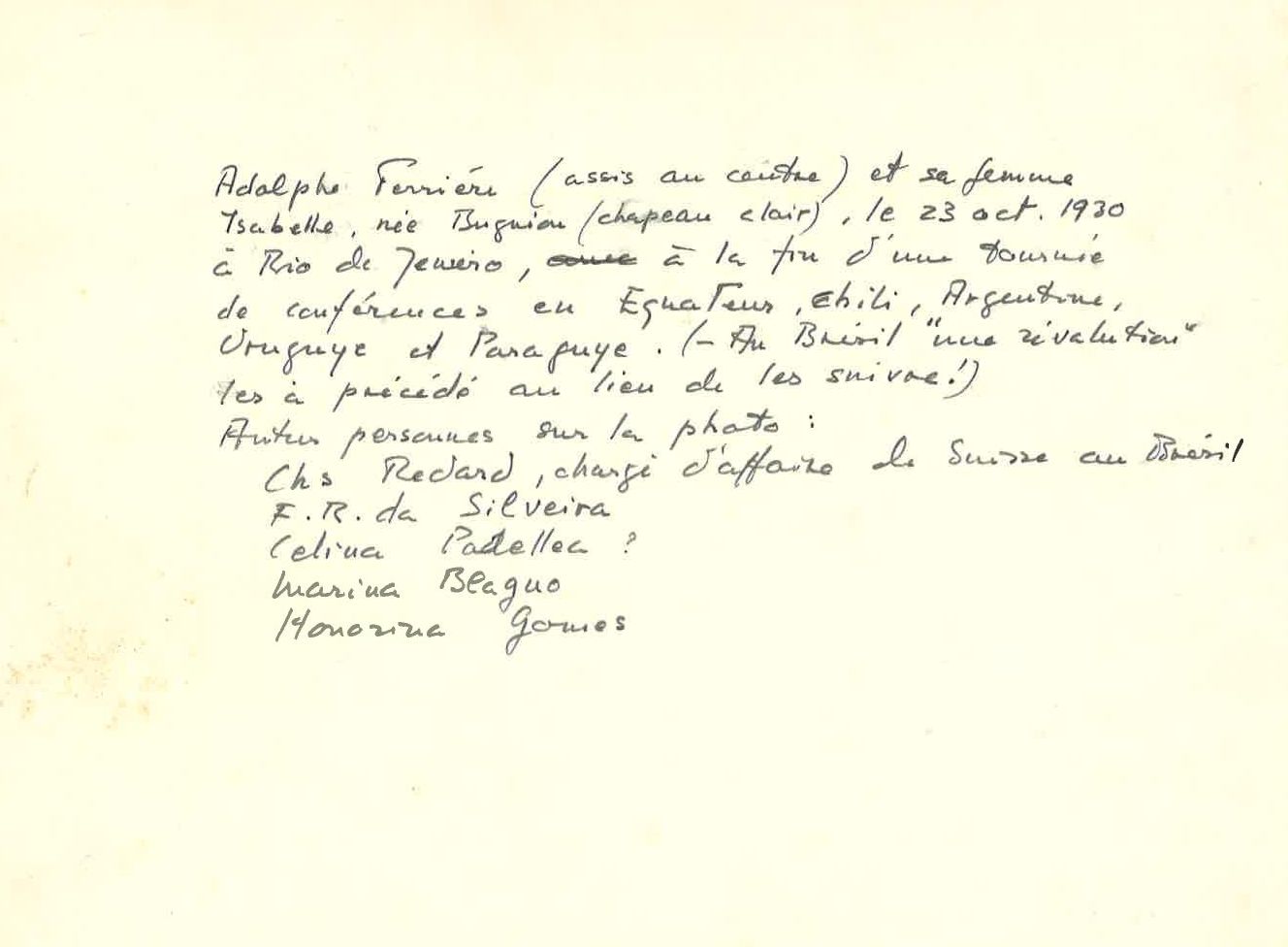 Petit journal d'A. Ferrière, 23 octobre 1930 Cette photo témoigne cependant de leur rencontre avec quelques personnalités du pays, parmi lesquelles Celina Padilha (secrétaire générale de la Fédération nationale des sociétés d’Education), Fernando Silveira (chef du laboratoire de biométrie et professeur), Chs. Rochard (fonctionnaire de l’Ambassade suisse au Brésil) ainsi que Marina Magno et Honorina Gomes (représentantes de l’Association brésilienne des professeurs).