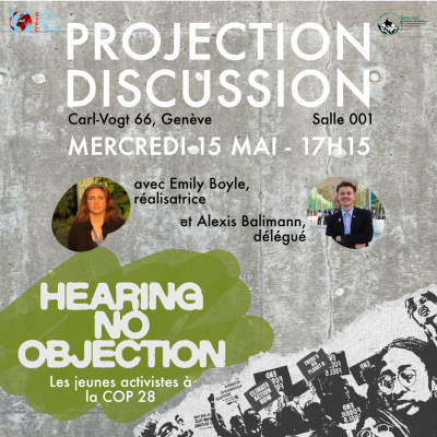 Une projection du film documentaire de Swiss Youth for Climate "Hearing no objection", sur le thème des jeunes activistes à la COP28 aura lieu le mercredi 15mai 2024. Elle sera suivie d’une discussion avec Emily Boyle (réalisatrice) et Alexis Balimann (délégué à la COP) animée par Matisse Le Strat.