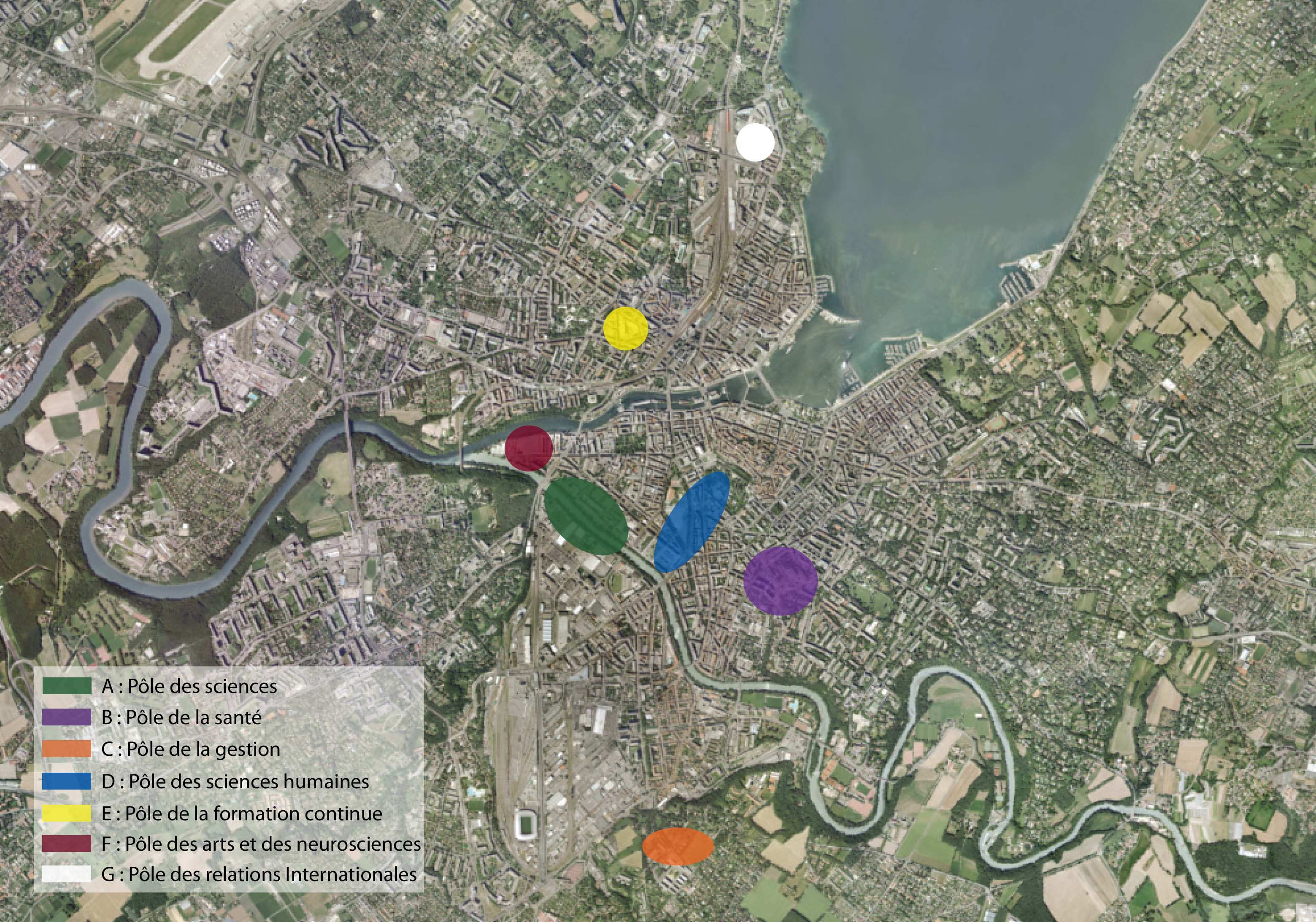 Le Service Immobilier prévoit le regroupement en 7 pôles académiques : le pôle des sciences, le pôle de la santé, le pôle de la gestion, le pôle des sciences humaines, le pôle de la formation continue, le pôle des arts et des neurosciences et le pôle des relations internationales.