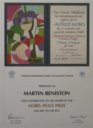 De 1993 à la fin 1998, il est nommé par le gouvernement suisse vice-président de l'un des groupes de travail du GIEC (en anglais, l'IPCC) qui a reçu le Prix Nobel de la Paix en 2007). Il participe également aux travaux du Comité directeur du GIEC ("IPCC Bureau") en tant que l'un des représentants suisses à ce comité. Le GIEC est reconnu aujourd'hui comme l'autorité scientifique internationale pour les questions scientifiques, sociales, économiques et environnementales liées au climat et aux changement climatiques. A la fin de son mandat de vice-président, Martin Beniston continue à contribuer aux rapports d'évaluation du GIEC, publiés en 1996, 2001, et 2007.