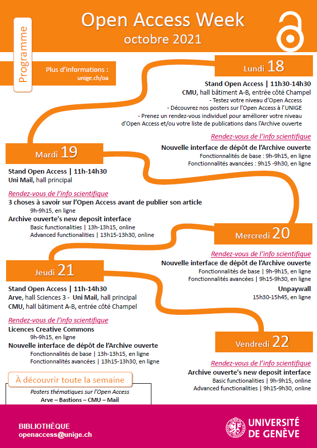Le programme que vous a concocté par les spécialistes OA des différents sites s'articule autour de stands dans les différents bâtiments (exposition permanente durant la semaine) et de diverses formations en lien avec la thématique de la semaine. Une importance particulière sera accordée à la toute nouvelle interface de dépôt dans l'Archive ouverte UNIGE, car cet outil joue un rôle prépondérant pour la voie verte (Green Road) du libre accès à l'information scientifique.