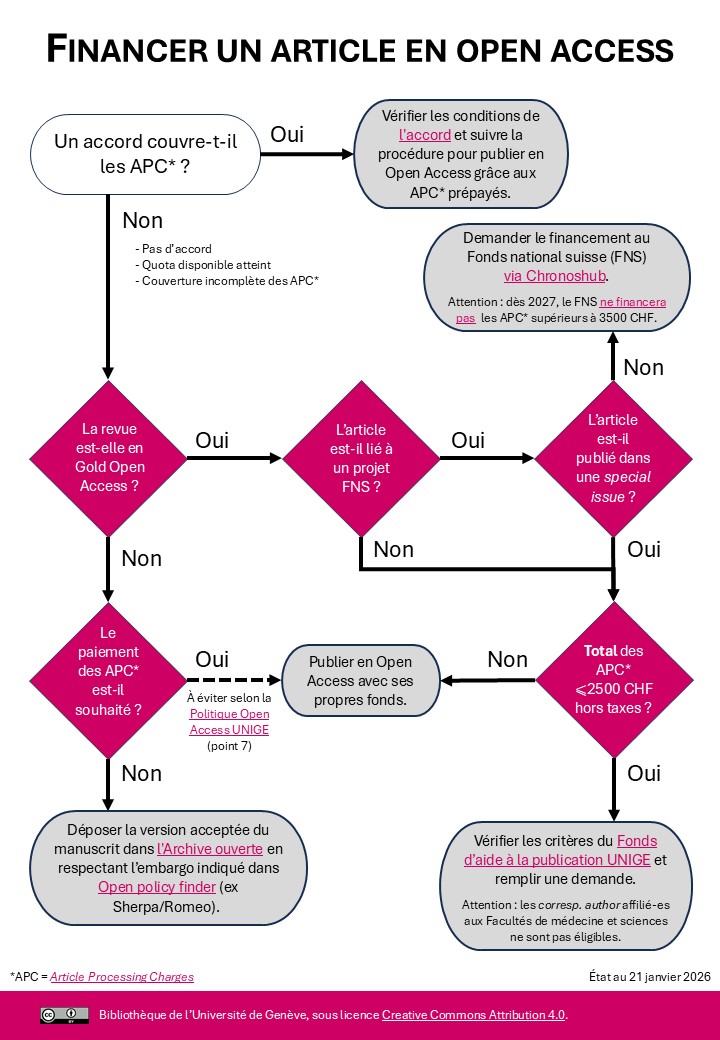 Le logigramme ci-contre (également disponible en PDF) présente différentes possibilités de financement d'un article en Open Access, ainsi que leurs conditions.