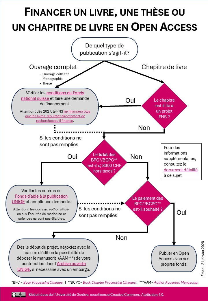 Pour le financement des livres, des thèses et des chapitres en Open Access, le logigramme ci-contre (également disponible en PDF) résume les différentes options existantes. Du fait de la complexité de la situation, un document complémentaire plus exhaustif est également à votre disposition.