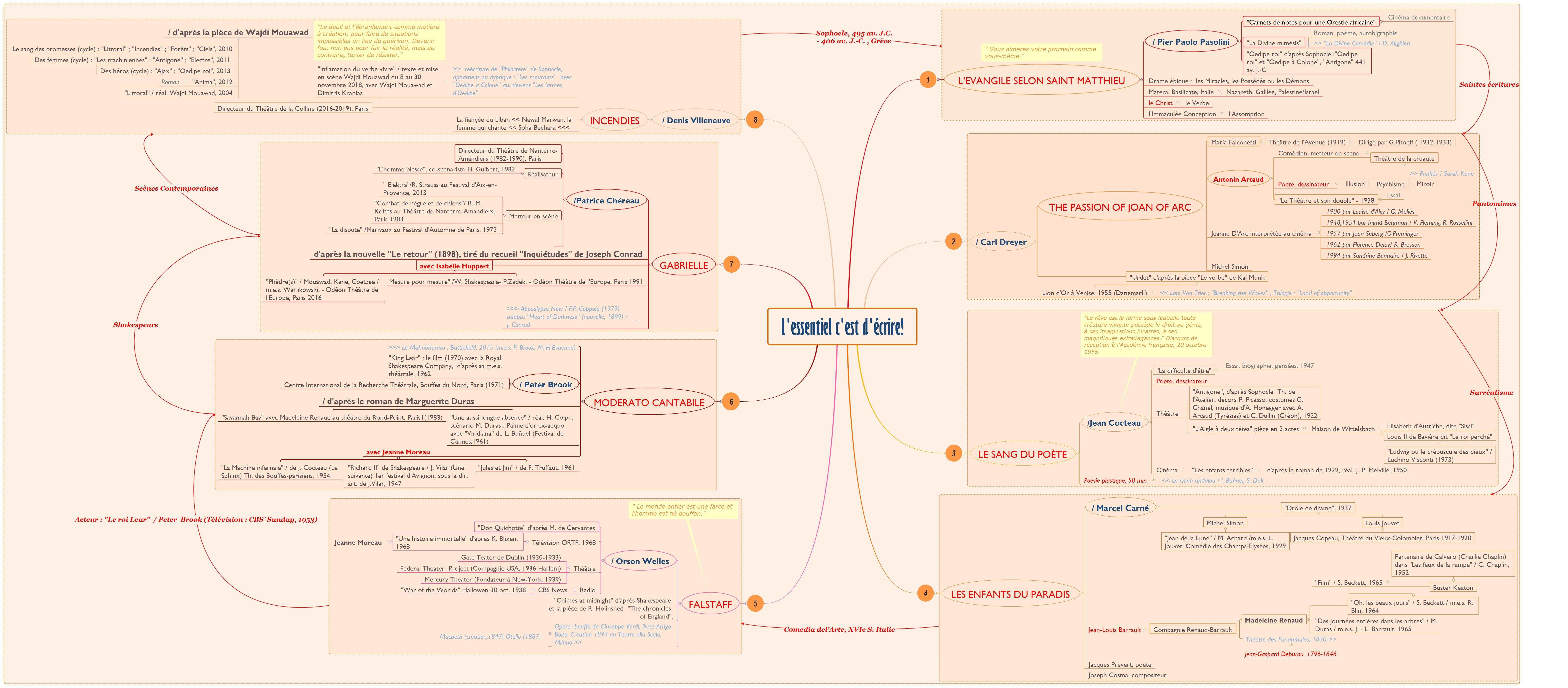 À la manière d’arrêts sur images sur une trame créative, le travelling s’interrompt sur des œuvres significatives pour se relier les unes aux autres à la façon d’une chanson en laisse ou une sorte de cadavre exquis dont chaque dernière évocation nous projette dans un nouvel univers. Une sélection des films principalement choisi pour illustrer le lien naturel qui réunit le théâtre au cinéma.