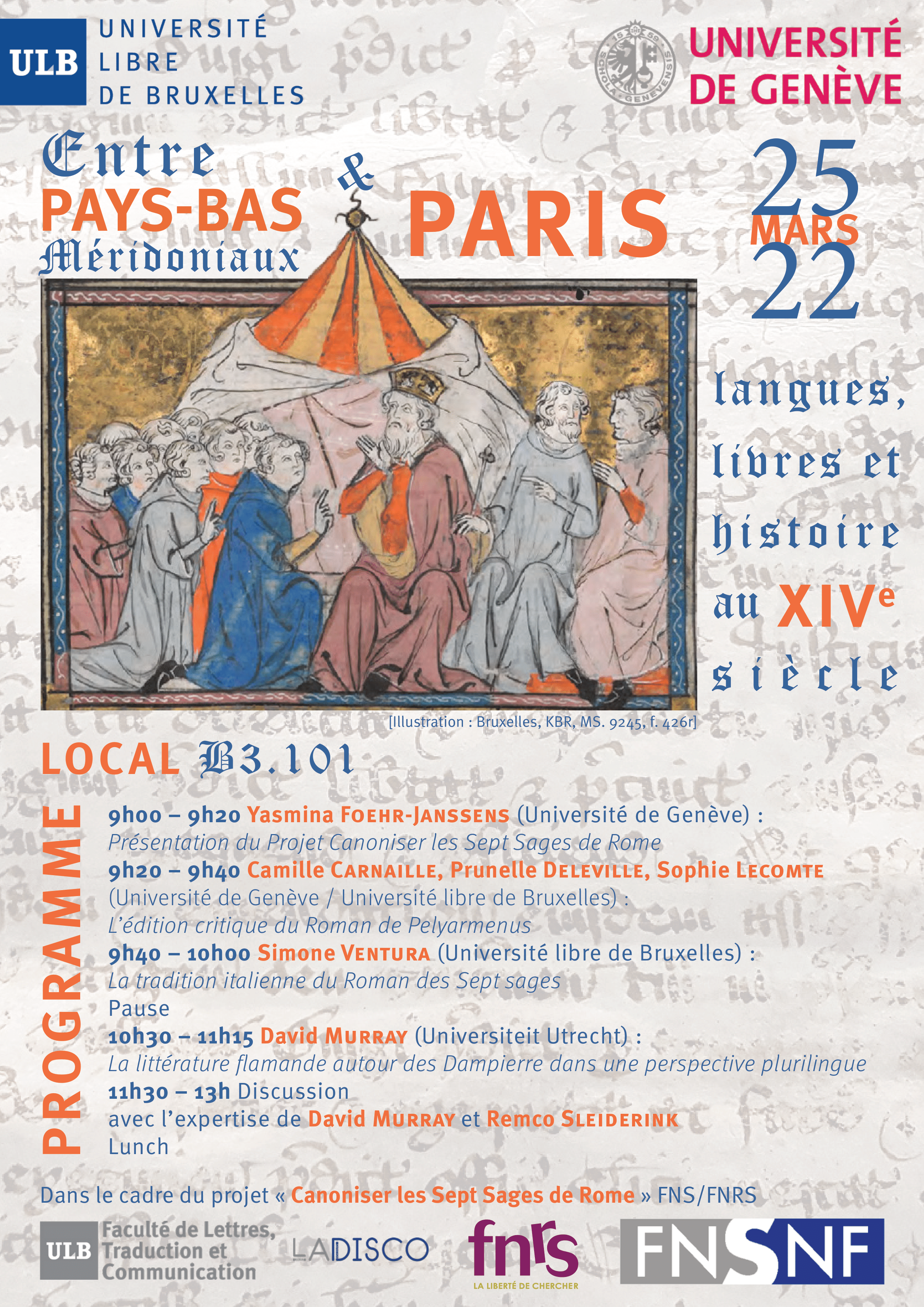 - 15 octrobre 2021 - ULB : Atelier sur les manuscrits du Cycle des Sept Sages de Rome avec l'expertise de Craig Baker (ULB), Olivier Collet (UNIGE), Yan Greub (ATLIF-UNINE), Marie-Laure Savoye (IRHT), Brigitte Roux (UNINE), Fabio Zinelli (EPHE) (affiche).