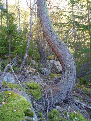 Quelques centaines de mètres plus loin, deux vieux mélèzes semblent perdus au milieu d’une vaste clairière dont le sol est couvert d’un capharnaüm de gros rocs aux contours saillants. «C’est le résultat d’une coulée qui s’est produite en 1890 et qui a tout détruit sur son passage avant de s’arrêter ici, explique le chercheur. Ces deux survivants, qui ont près de 600 ans, ont été blessés et tordus par la pression des pierres, mais ils ont eu la chance d’en réchapper et de pouvoir reprendre une croissance normale.»