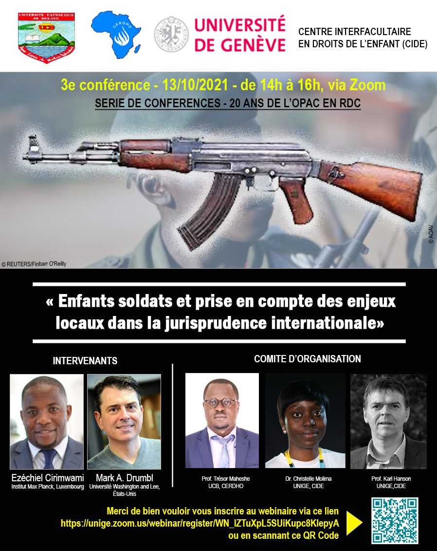 Ces tensions et interactions entre les études en droits de l’enfant et les autres champs du droit international seront au cœur de cette série de conférences organisée par le Centre interfacultaire en droits de l'enfant de l’Université de Genève (CIDE) en collaboration avec le Centre régional de droits de l’homme et de droit international humanitaire de l’Université catholique de Bukavu (CERDHO). Portée par les 20 ans de la ratification par la RDC de l’OPAC, qui seront célébrés cette année, l’objectif de ces conférences est d’offrir un espace de réflexions critiques sur la manière dont le droit et la pratique tant internationale que nationale investissent la question des enfants soldats.