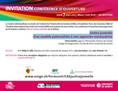 Le Centre interfacultaire en droits de l’enfant de l’Université de Genève (CIDE), la Fondation Terre des hommes (Tdh) et l’Institut international des droits de l’enfant (IDE) ont le plaisir de vous inviter à la conférence d’ouverture du programme de formation continue CAS en Justice juvénile sur le thème Justice juvénile: d’un modèle paternaliste à une approche restauratrice.