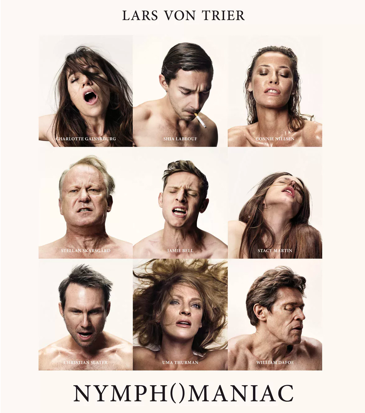 Von Trier scinde astucieusement son titre à l’aide de parenthèses faisant ainsi, en plus de la référence évidente à une vulve, apparaître les deux bases étymologiques composant la nymphomanie. D’un côté nymphe: “jeune fille gracieuse et bien faite; repli membraneux de la vulve; divinité féminine de l’antiquité greco-romaine, personnifiant divers aspects de la nature et représentée le plus souvent sous les traits d’une jeune fille nue”. (Larousse [en ligne], consulté le 11.11.19) et de l’autre côté maniaque: “qui est obsédé par quelques chose, qui s’attache avec un goût et un soin excessif à des détails”. (Larousse [en ligne], consulté le 11.11.19). Cette perspective permet de percevoir Joe, personnage principal, comme une nymphe, par son aspect parfois surnaturel, divin, désintéressée par le fourmillement humain autour d’elle. “As a quite young nymph” (00:16:11) dit-elle en racontant sa propre histoire, ce qui, en plus de ses caractéristiques physiques, dans le premier volume lorsqu’elle est jouée par Stacy Martin, va de pair avec les représentations habituelles des nymphes en tant que “jeunes filles gracieuses”. Ainsi, cette perspective nous pousse à voir Seligman comme maniaque. Le deuxième protagoniste de l’histoire, reprenant en image négative le personnage de Joe, complète alors le titre de cette oeuvre. Il serait maniaque dans l’ajustement du moindre détail de la pièce, qu’il utilise afin d’y puiser de l’inspiration pour y construire une narration. De plus il vit dans un appartement d’aspect monastique, austère, comme débarrassé de toutes futilités. Cette perspective fait appel à une définition dérivant plus du sens commun que du médical. Mais elle est intéressante car elle gracie Joe, dé-criminalisant ses actions, en la peignant comme un être beau, pur, presque divin, supportant ainsi ses désirs de sexualité libre de contrainte, libre même d’érotisme, dénudant les pulsions sexuelles jusqu’à leur forme les plus simples. Ses peines et ses déboirs sont dûs aux autres, y compris Seligman qui, malgré ses airs empathiques, n’atteint pas cet état irréel d’être parfait, allégorique et tente de salir Joe dans cette scène volontairement choquante et inattendue de la fin du deuxième volume.