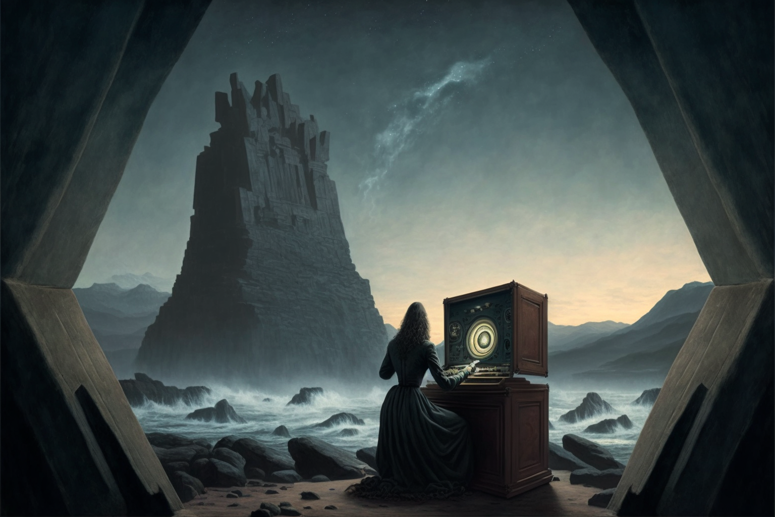 The AI generated image represents both the adventurous endeavor to explore emotional skills, while being encased in the safe environment of your favorite tunes. It’s dark and somewhat stormy, yet strangely comforting.