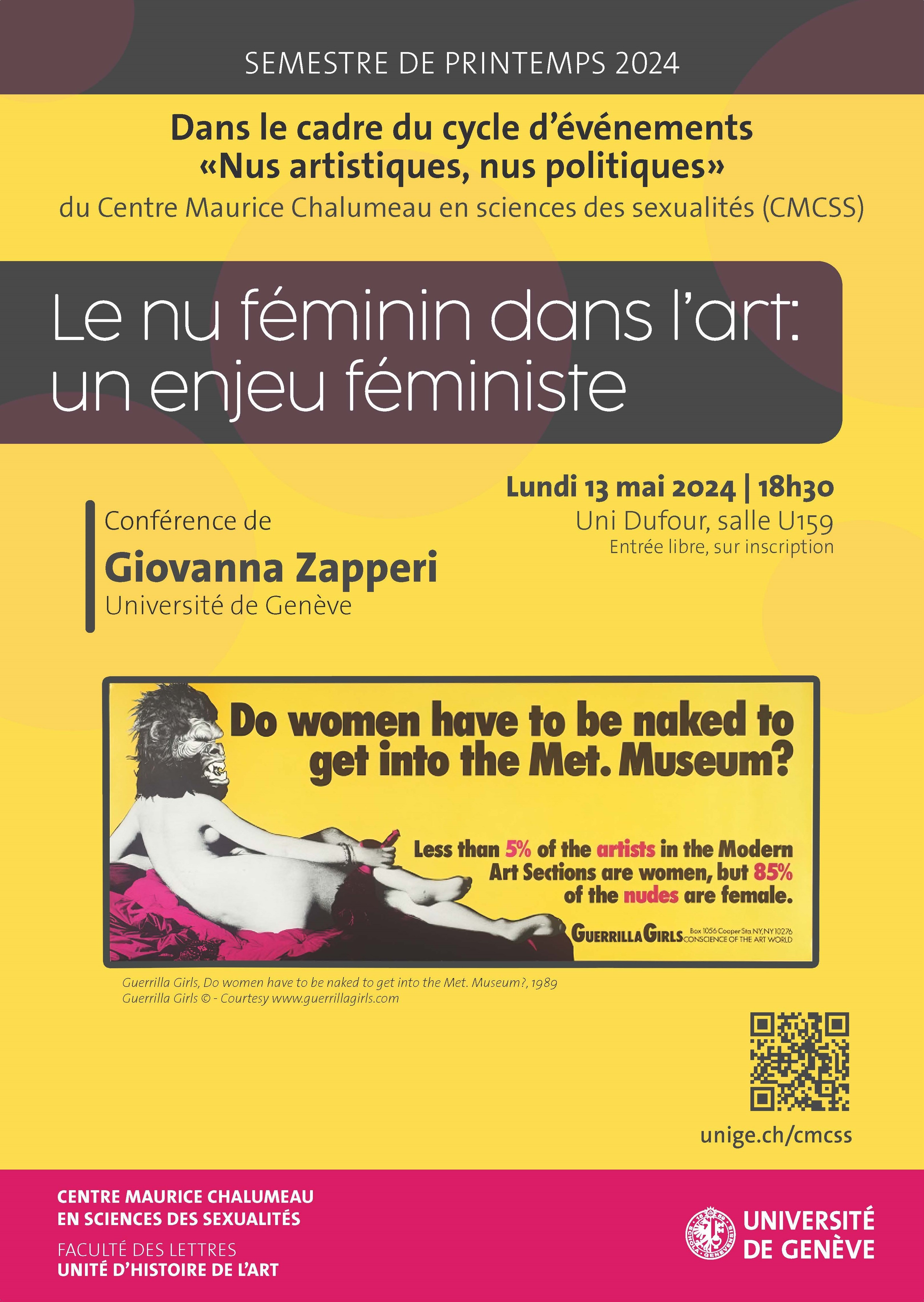 Chaque semestre, le Centre Maurice Chalumeau en sciences des sexualités de l’Université de Genève (CMCSS) propose un cycle thématique visant à éclairer, sous l'angle des sexualités, un thème phare et d'actualité. Pour le semestre de printemps 2024, le CMCSS a choisi d'aborder le thème des « nus artistiques, nus politiques ».