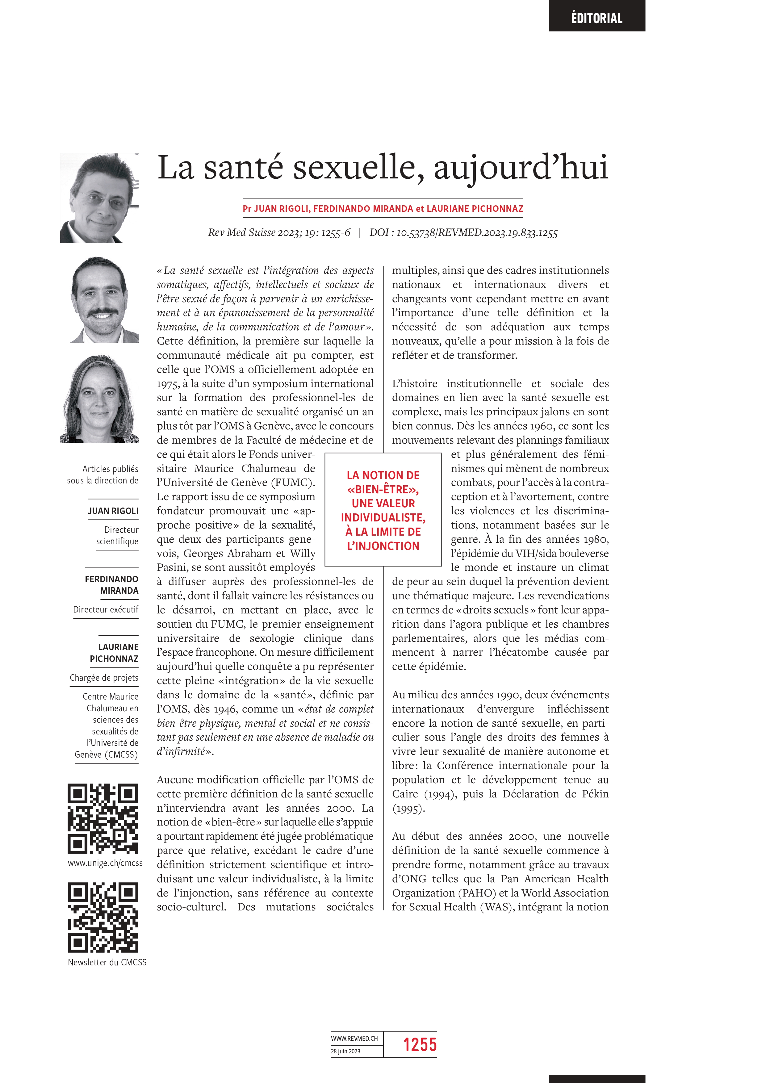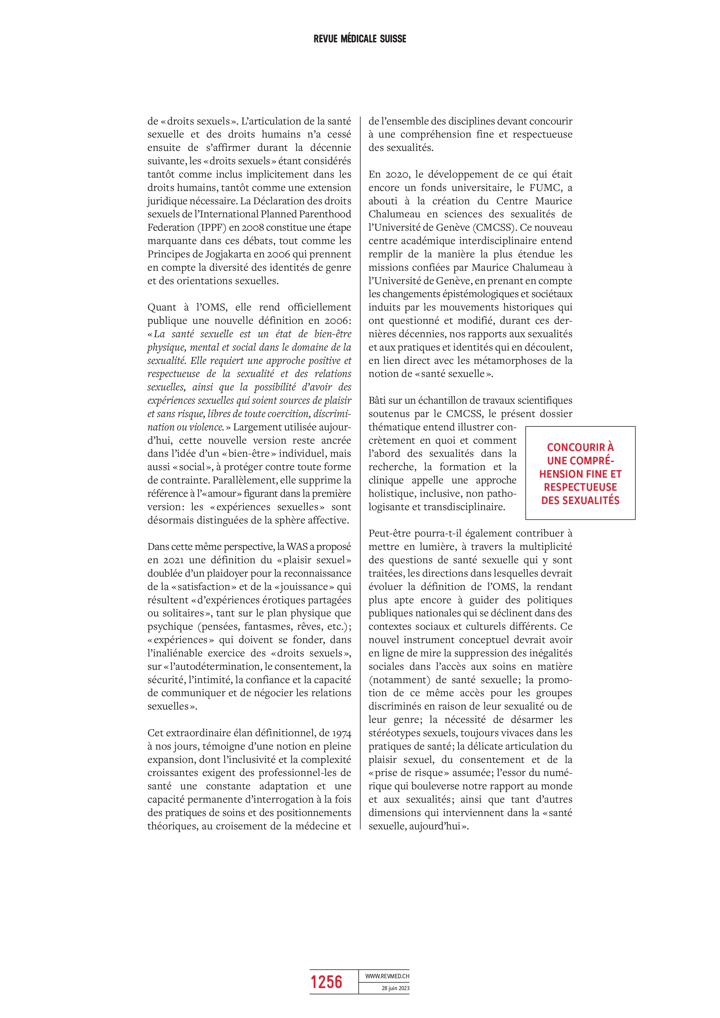 Dans le numéro thématique de la Revue Médicale Suisse « Sexualités » de juin 2023 coordonné par le CMCSS, l’éditorial met en avant une histoire de la notion de santé sexuelle ainsi que des pistes réflexives pour une nouvelle définition.