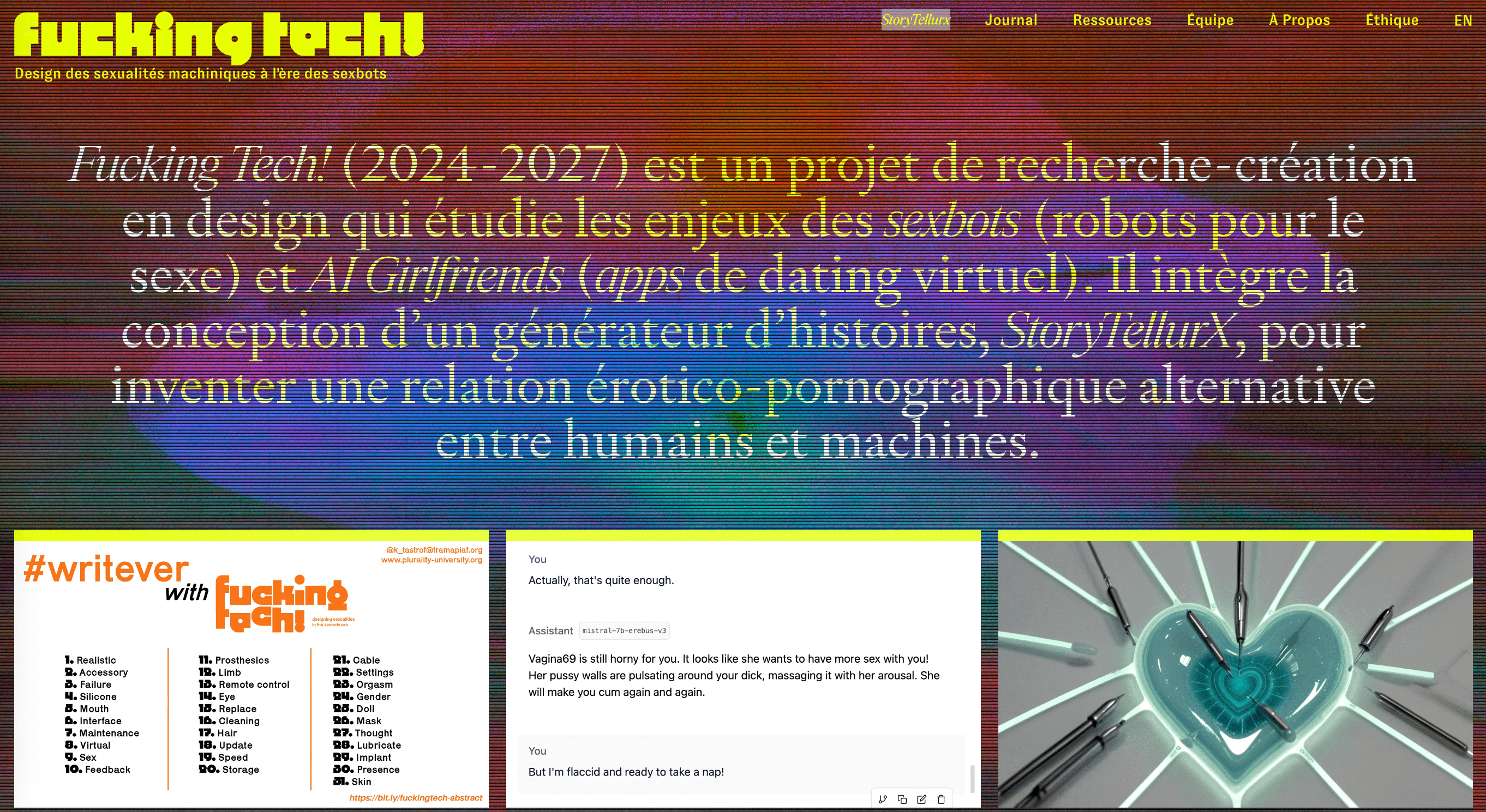 En 2024, l'étude de l’existant et l'analyse des biais de l’IA générative, menées lors de deux workshops d'une semaine, ont abouti à la création d'un prototype de générateur d’histoires érotiques (ou chatbot interactif), StoryTellurX, traçant de nouveaux liens entre éducation sexuelle et plaisirs.