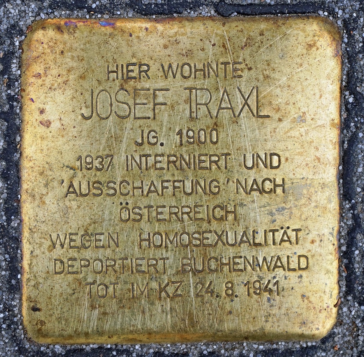 Tuile: © Albinfo. Stolpfersteine posée à Zürich en mémoire de Josef Traxl, né en Suisse en 1900 de parents autrichiens, et déporté à Buchenwald en raison de son homosexualité.