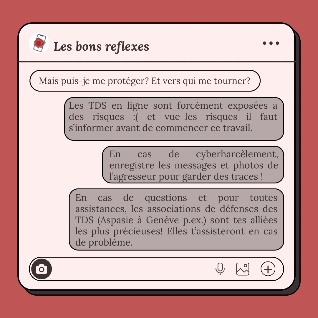 - 3 vidéos d’environ 2 minutes chacune abordant différents thèmes : tout d’abord les risques liés au TDS en ligne, puis le rôle des plateformes et enfin la déconstruction des préjugés autour des travailleuses en ligne.