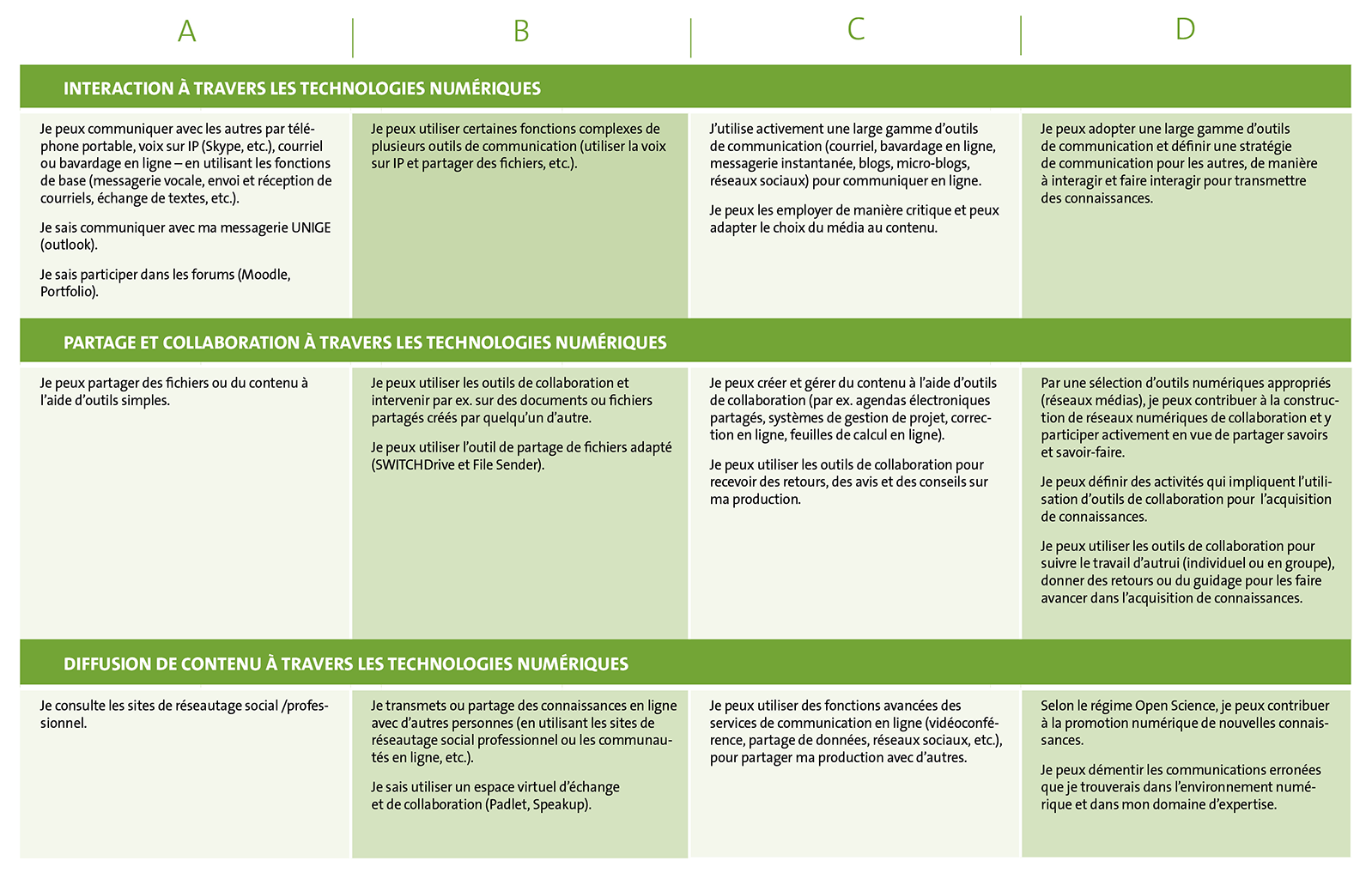 - D: niveau avancé incluant transmission et mobilisation des compétences numérique chez les autres.