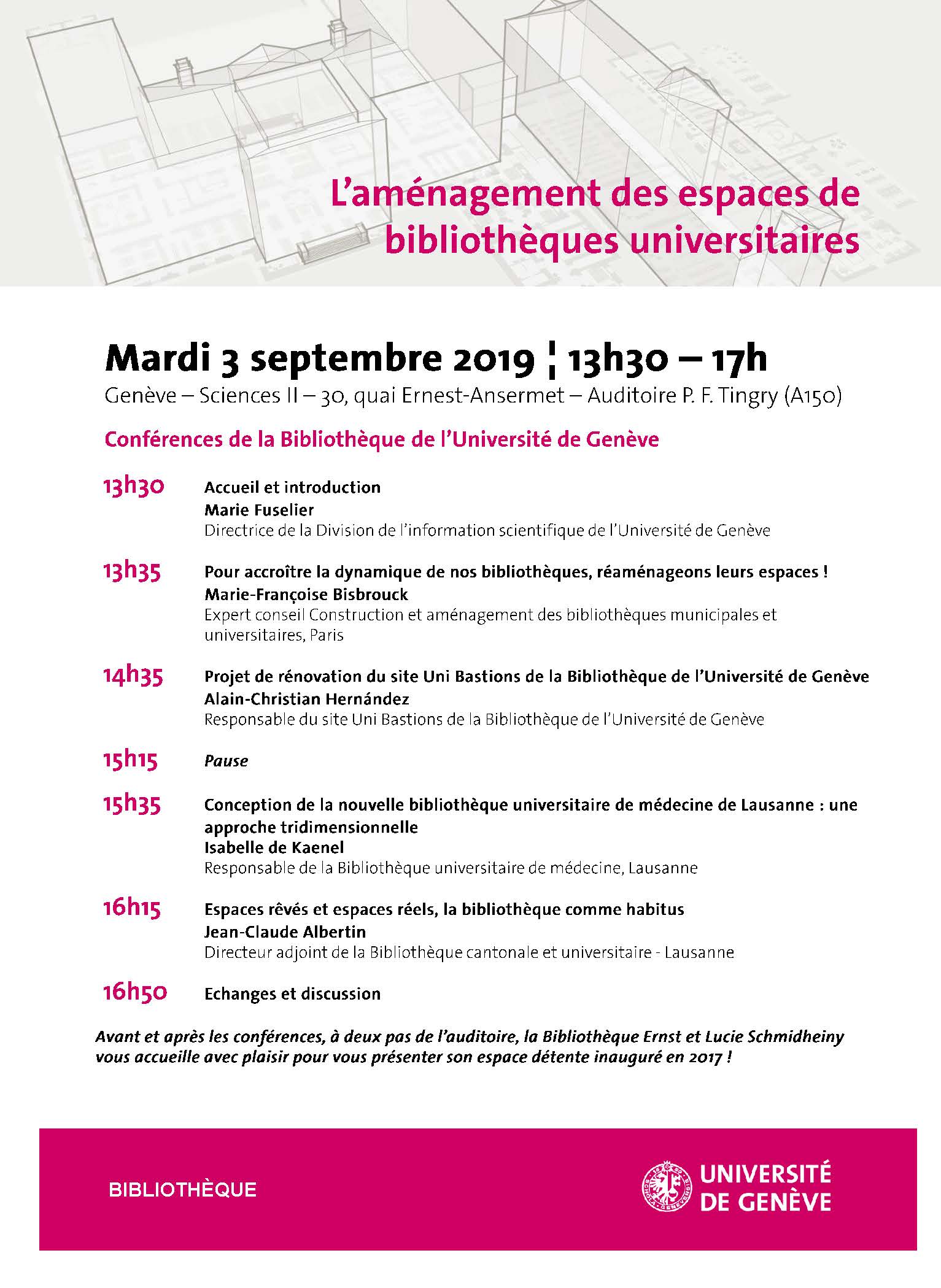 - Avant et après les conférences, à deux pas de l’auditoire, la Bibliothèque Ernst et Lucie Schmidheiny vous accueille avec plaisir pour vous présenter son espace détente inauguré en 2017 !