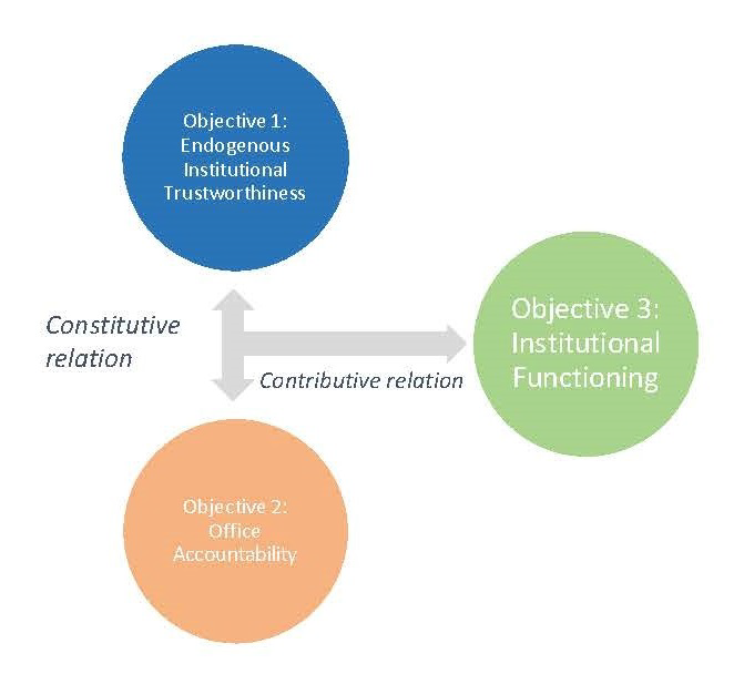 These two related questions track the twofold aim of the project. They guide the study of the constitutive relation between office accountability and endogenous institutional trustworthiness and the contributive relation between these properties and institutional functioning. The project aims to realize three main specific research objectives.