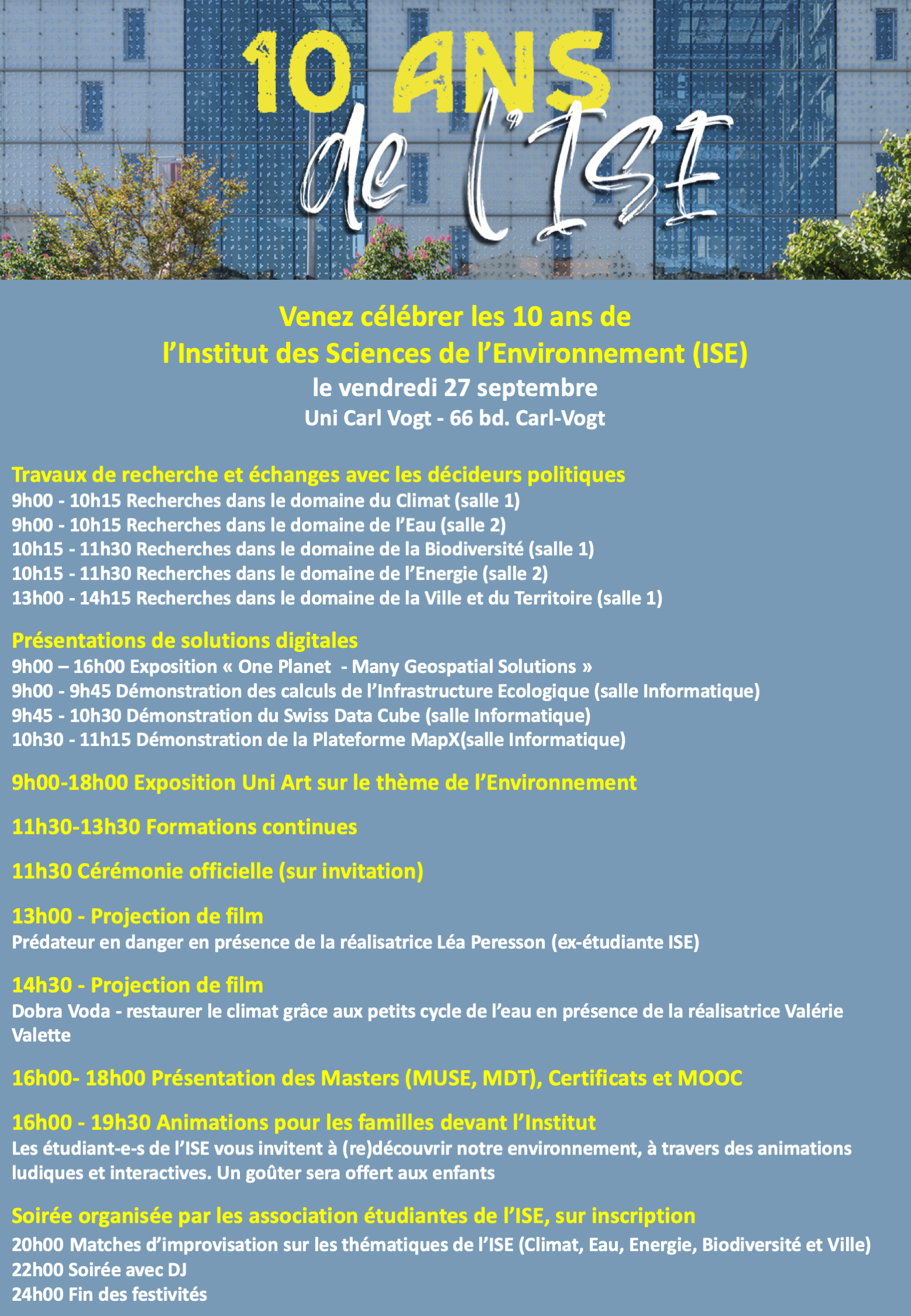 Pour ce jubilé, qui a été célébré le 27 septembre 2019, l'ISE a organisé une journée de découverte de ses travaux de recherche, de ses programmes de formation et de son rôle à l'interface entre la science, la politique et la société dans le domaine de l’environnement (voir le programme complet).