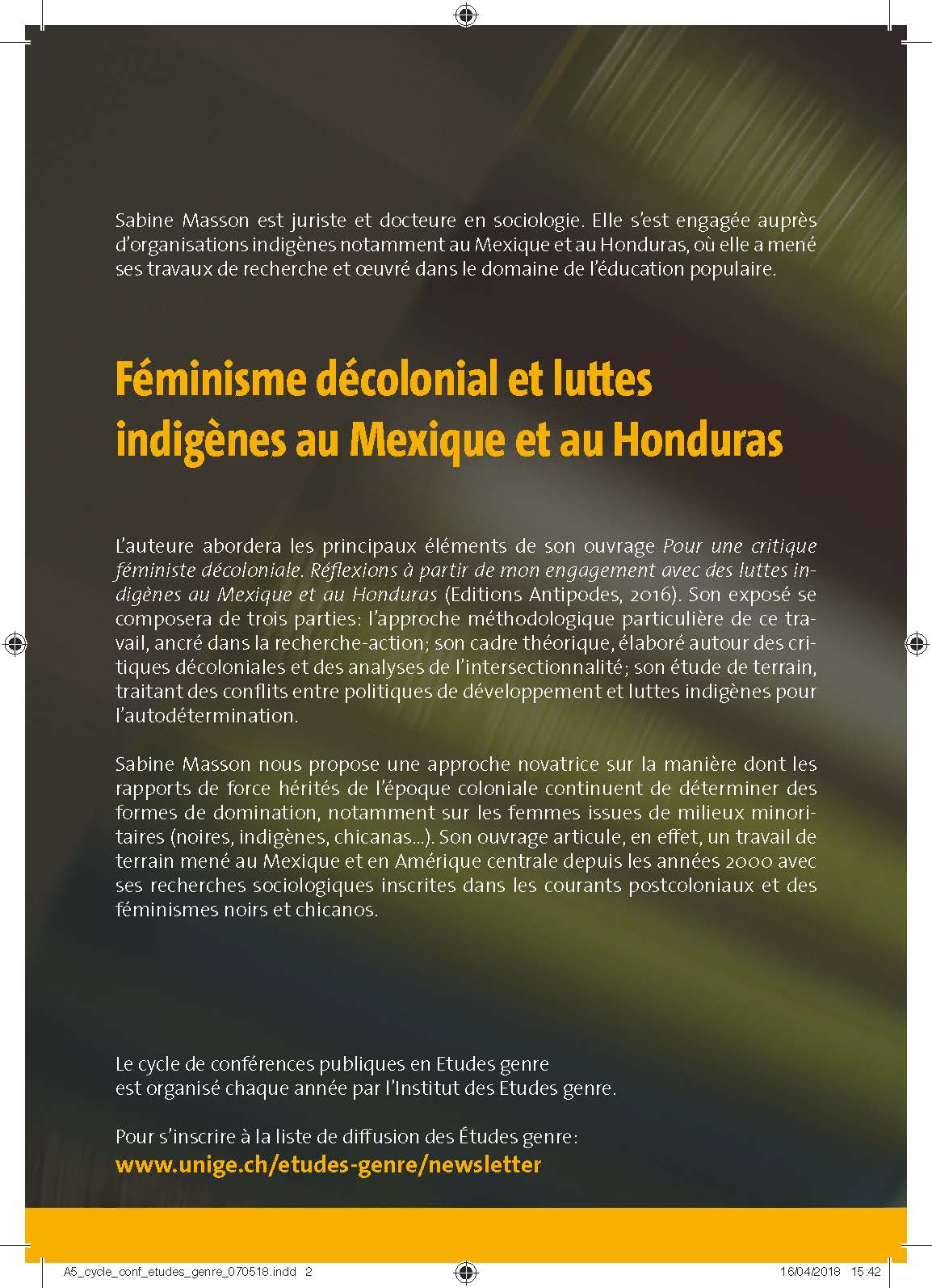CYCLE DE CONFÉRENCES PUBLIQUES EN ÉTUDES GENRE 2017-2018 Les lundis | entrée libre | 18h15-20h Les conférences sont suivies d’une discussion |