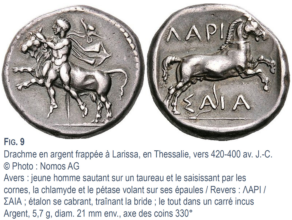 Sur la monnaie de Larissa, la principale ville de Thessalie, la taurokathapsie est très habilement représentée (Fig. 9). Marque d’indépendance, de dextérité et mise en garde aux ennemis, de nombreuses drachmes et didrachmes furent ainsi frappés aux meilleurs jours du pays, entre 475 et 395 av. J.-C.
