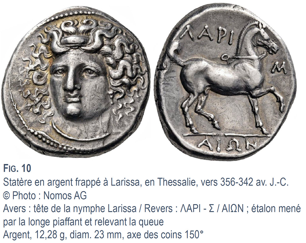 Fait que l’on peut dire unique dans la numismatique grecque, les graveurs de la monnaie thessalienne ont laissé des « portraits » et des instantanées d’étalons et de juments d’un naturalisme saisissant (Fig. 10).