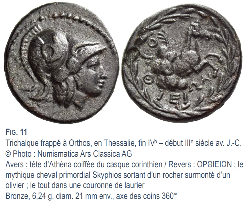 Selon le mythe, le cheval aurait été créé par Poséidon. Celui-ci l’avait fait jaillir d’un rocher (Fig. 11), lors d’un pari censé déterminer qui ferait le meilleur don à l’homme. D’après les Athéniens, Athéna avait gagné en créant quant à elle l’olivier ; les Thessaliens en étaient-ils intimement convaincus ?