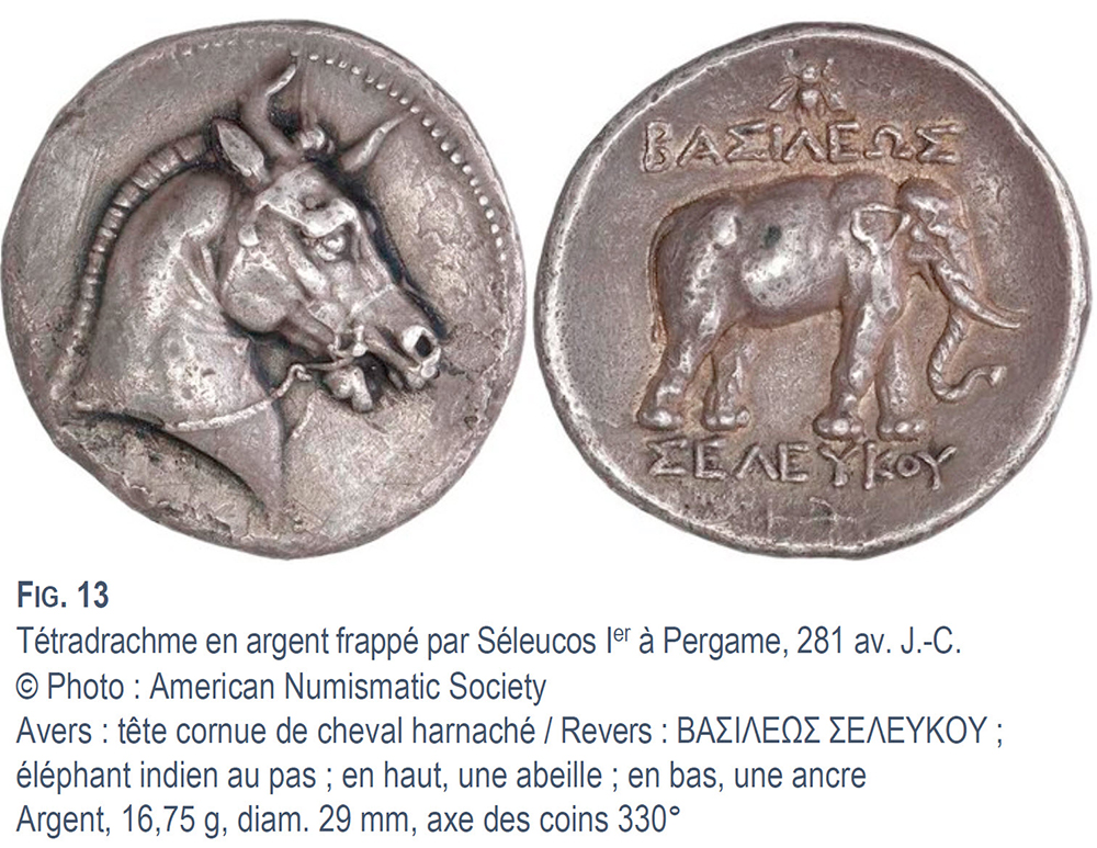 La deuxième monnaie a été émise à Pergame, à un moment où Séleucos tourne ses ambitions vers l’ouest, dans une tentative de reconstituer l’empire d’Alexandre qui finit brusquement avec son assassinat en 281 av. J.-C. Le cheval cornu se substitue au roi à l’avers – signe de son importance capitale – et laisse sa place au revers à un éléphant (Fig. 13). Séleucos exhibe orgueilleusement aux Grecs d’Asie Mineure ses « machines de guerre », de la même manière que les grandes puissances d’aujourd’hui font défiler leurs chars de combat, leurs missiles et leurs drones.