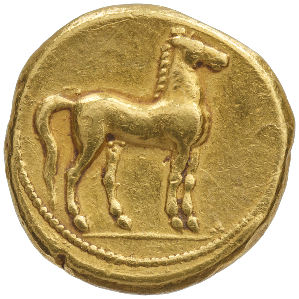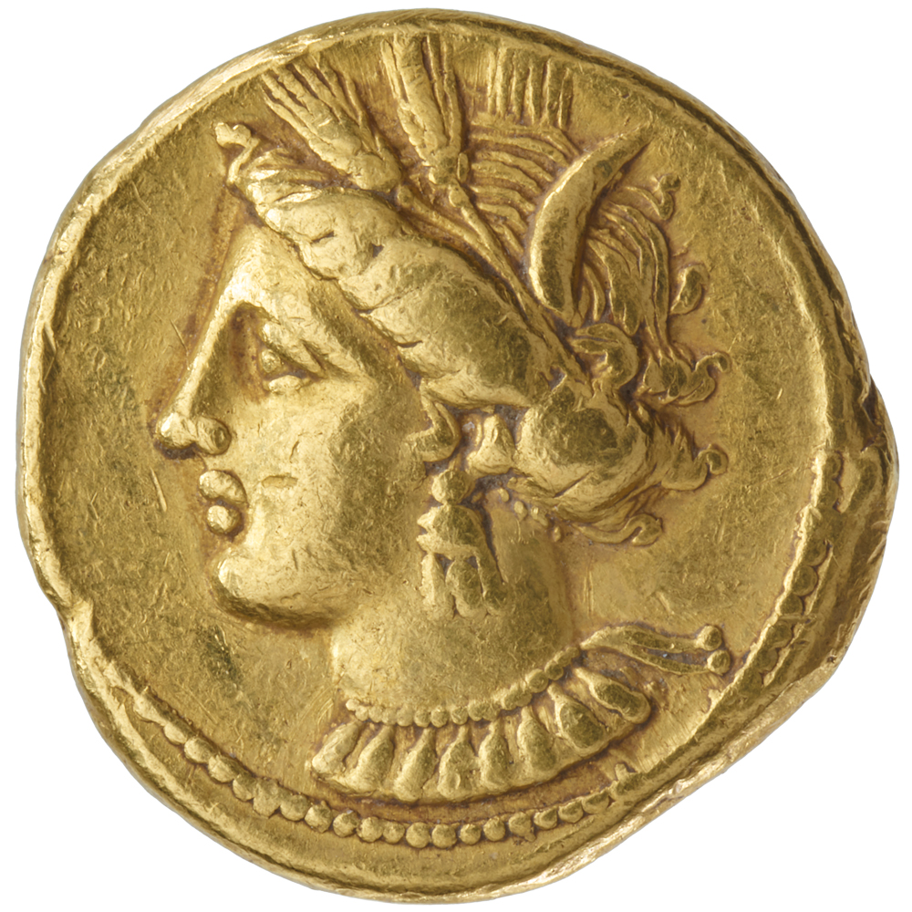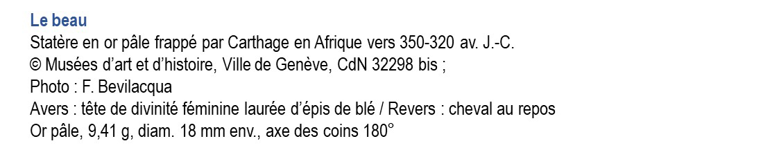 L’iconographie de la première monnaie punique est d’inspiration grecque (Fig. 15). On y reconnaît à l’avers l’avant-train d’un cheval couronné par une Victoire ailée qui n’est rien d’autre qu’un « zoom » légèrement modifié sur les quadriges des tétradrachmes syracusains. Carthage proclame ainsi haut et fort son intention renouvelée de disputer l’hégémonie en Sicile à Syracuse, son ennemie traditionnelle. Au revers figure un palmier, dit phoinix en grec, « l’arbre phénicien », qui évoque l’identité de l’autorité émettrice et ses origines phéniciennes.